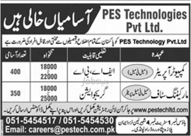 PES Technologies Rawalpindi Jobs 2020 for 750+ Computer Operators & Marketing Staff