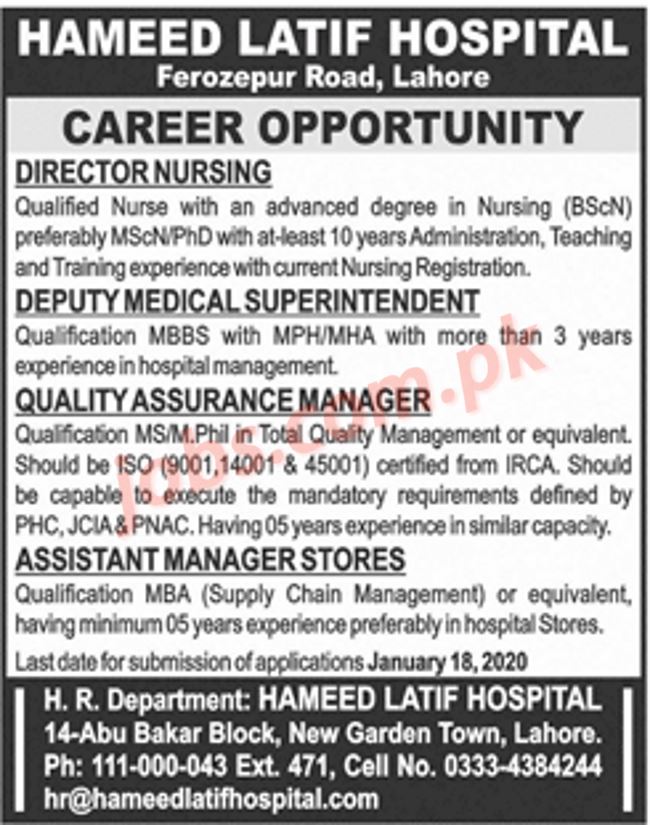 Hameed Latif Hospital Lahore Jobs 2020 for Assistant Manager, QA Manager, Director Nursing and Superintendent