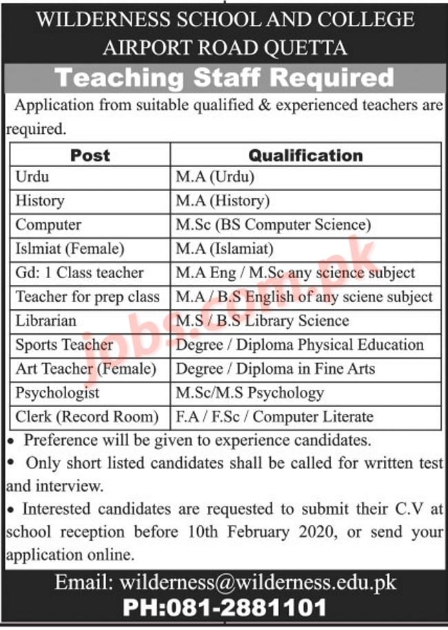 Wilderness School & College Quetta Jobs 2020 for Teaching & Non-Teaching Staff