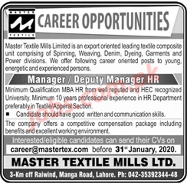Master Textile Mills Limited Jobs 2020 for Manager / Deputy Manager HR