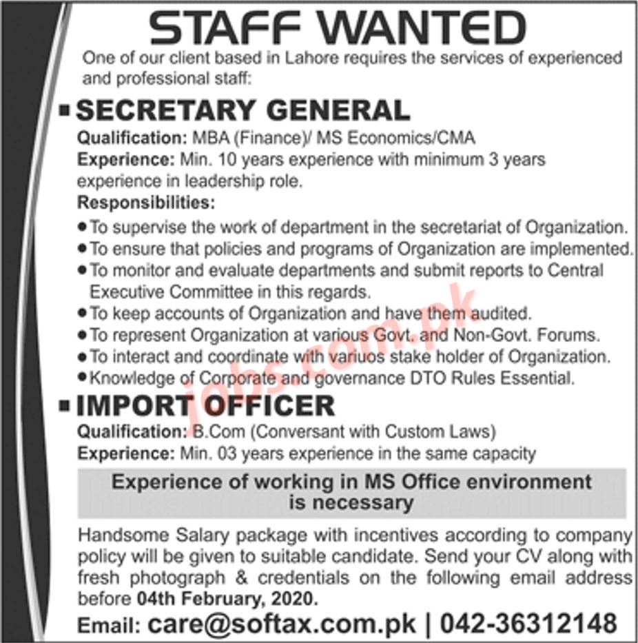 Softax Lahore Jobs 2020 for Secretary General and Import Officer Post