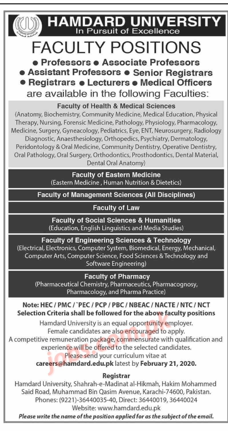 Hamdard University Karachi Jobs 2020 for Medical Officers, Registrars and Teaching Faculty