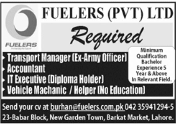 Fuelers (Pvt) Ltd Jobs 2020 for Transport Manager, Accountant, IT Executive and Vehicle Mechanic Vacancies