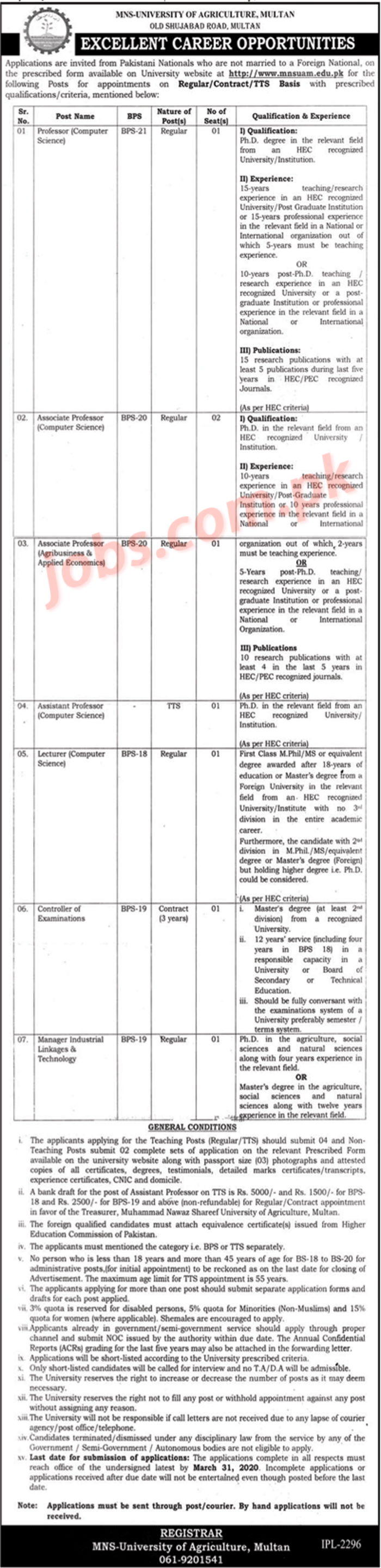 MNS-University of Agriculture Multan Jobs 2020 for 7+ Teaching and Non-Teaching Posts