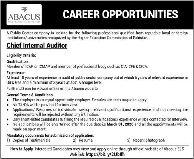 ABACUS Public Sector Company Jobs 2020 for Chief Internal Auditor Post