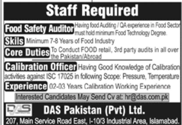 DAS Pakistan Pvt Ltd Islamabad Jobs 2020 for Food Safety Auditor and Calibration Officer