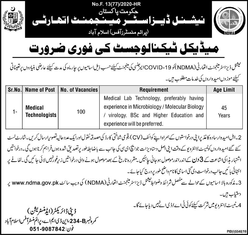 National Disaster Management Authority (NDMA) Jobs 2020 for 100+ Medical Technologists