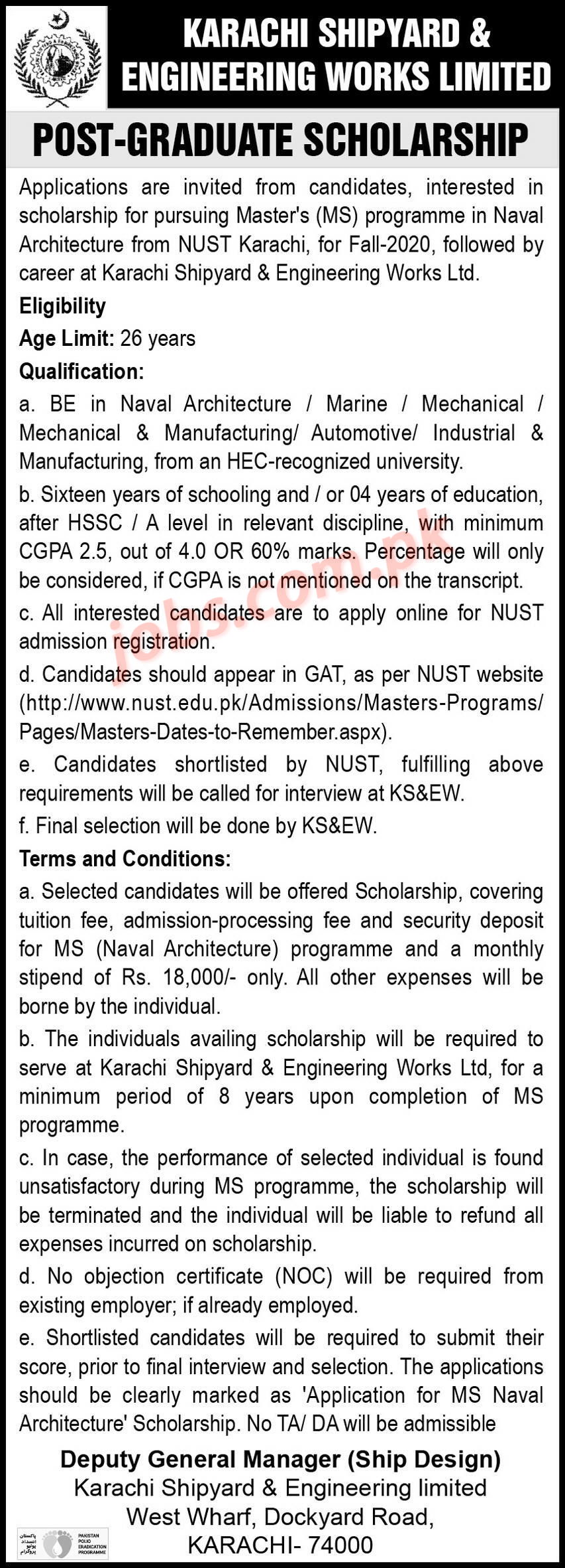 Karachi Shipyard & Engineering Works Ltd Post Graduate Scholarship 2020/21