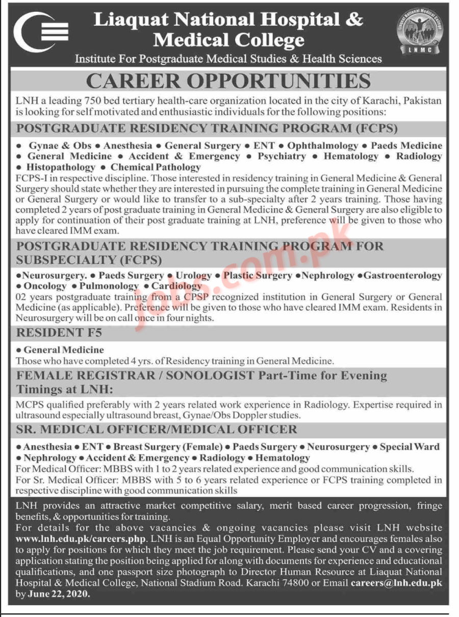 Liaquat National Hospital & Medical College Jobs 2020 for Medical Officers & Post Graduate Residency Training Program and Other