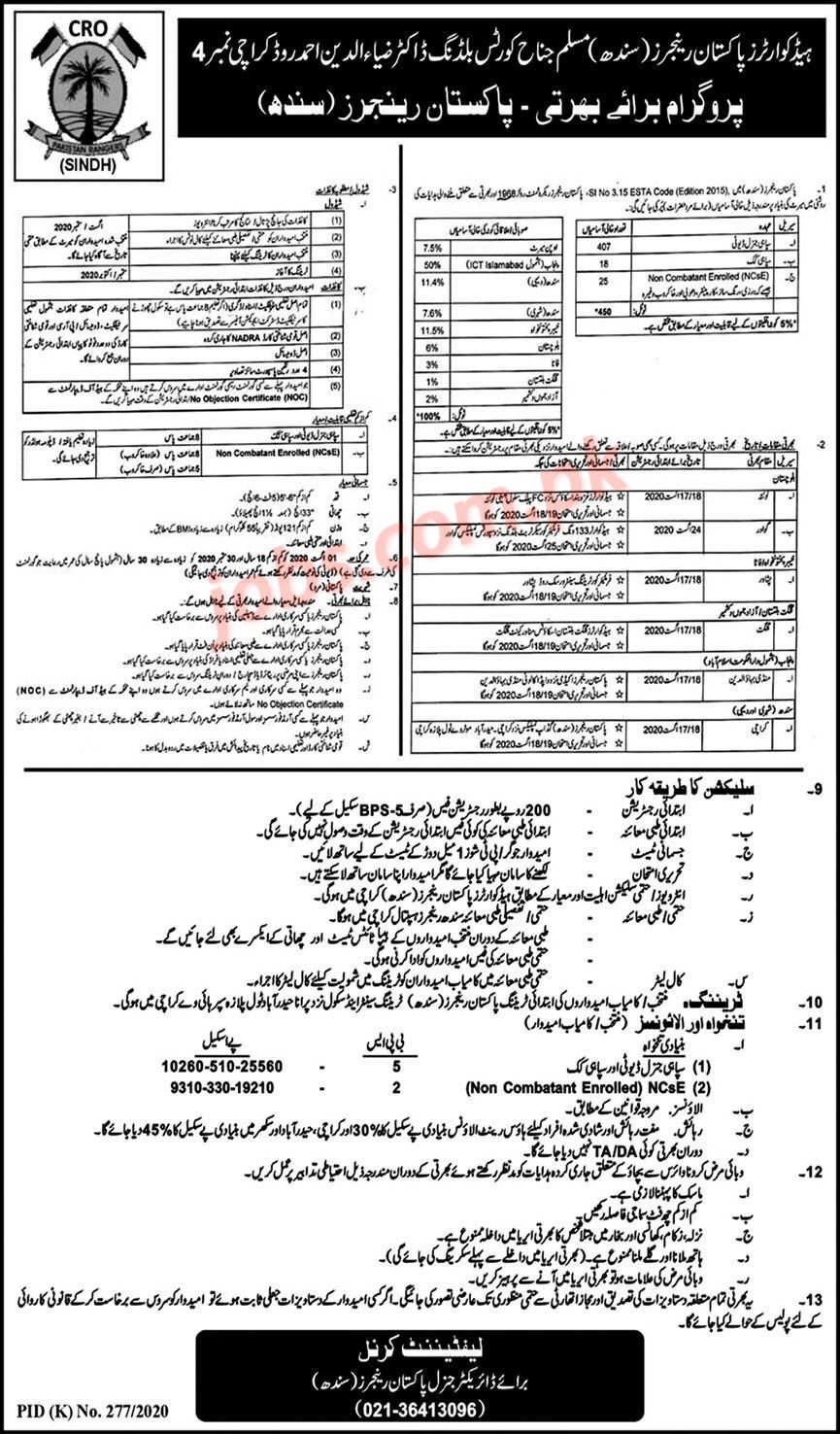 Pakistan Rangers (Sindh) Jobs 2020 for 450+ GD Sepoy, Sipahi Cook, NCEs and Other