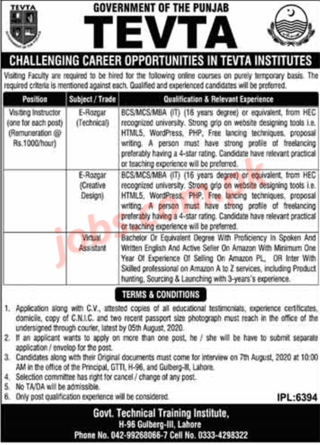 TEVTA Punjab Jobs 2020 for Teaching Staff