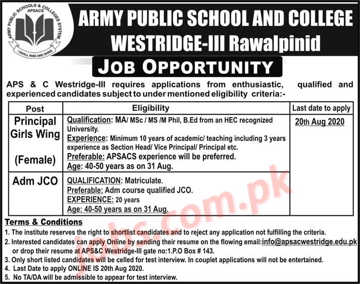 APSC Rawalpindi Jobs 2020 for Female Principal and Admin JCO