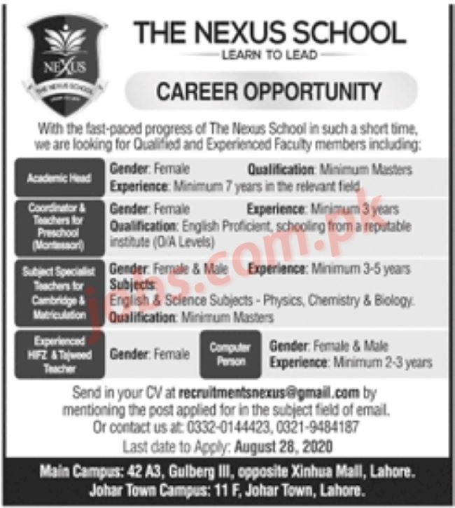 The Nexus School Lahore Jobs 2020 for Academic Head, Coordinator and Teaching Staff