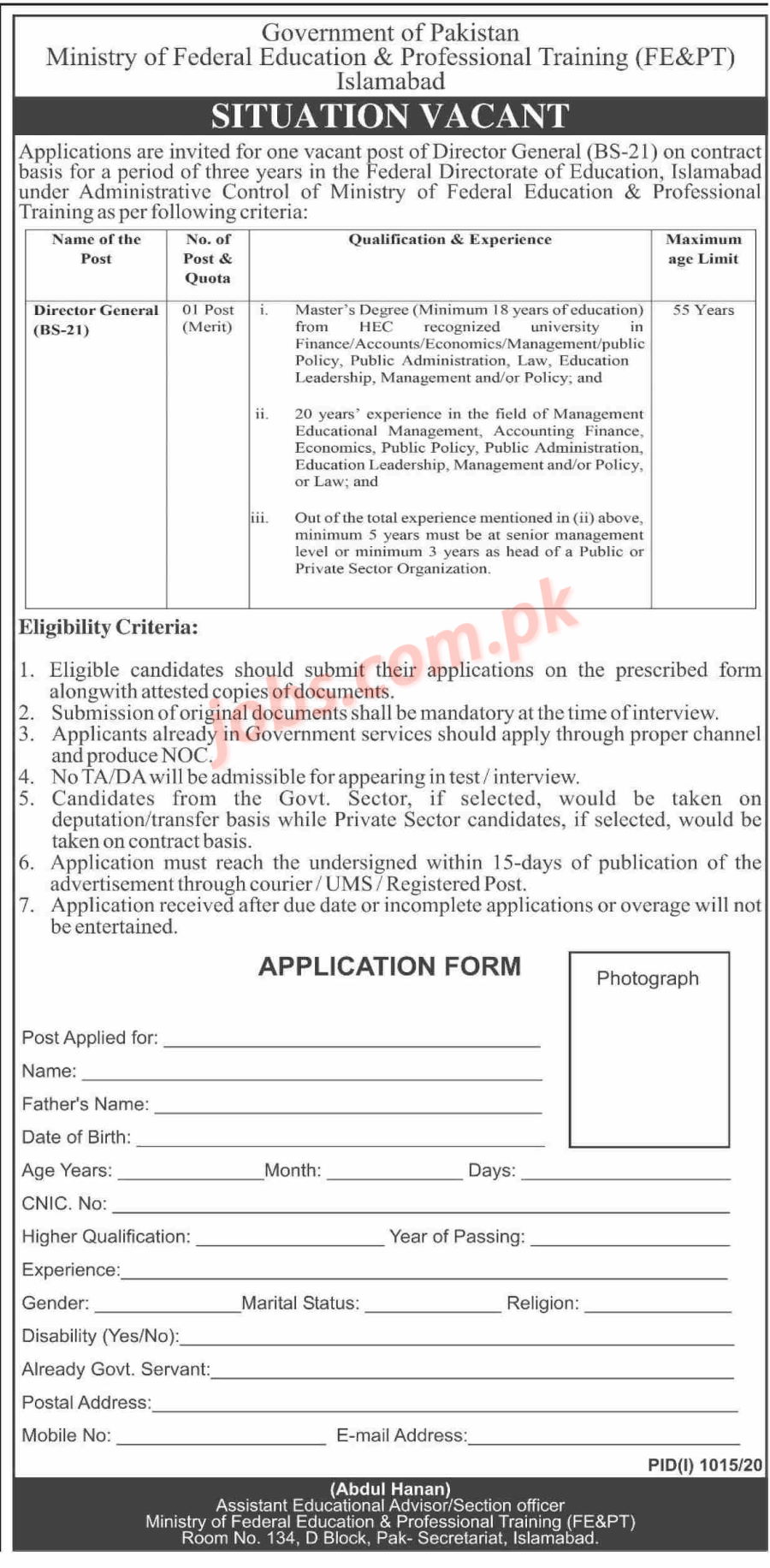 Ministry of Federal Education & Professional Training Jobs 2020 for Director General