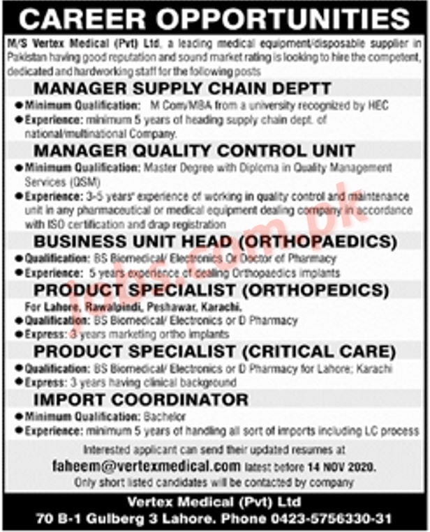 Vertex Medical Pvt Ltd Jobs 2020 for Managers, Coordinator, Unit Head & Other