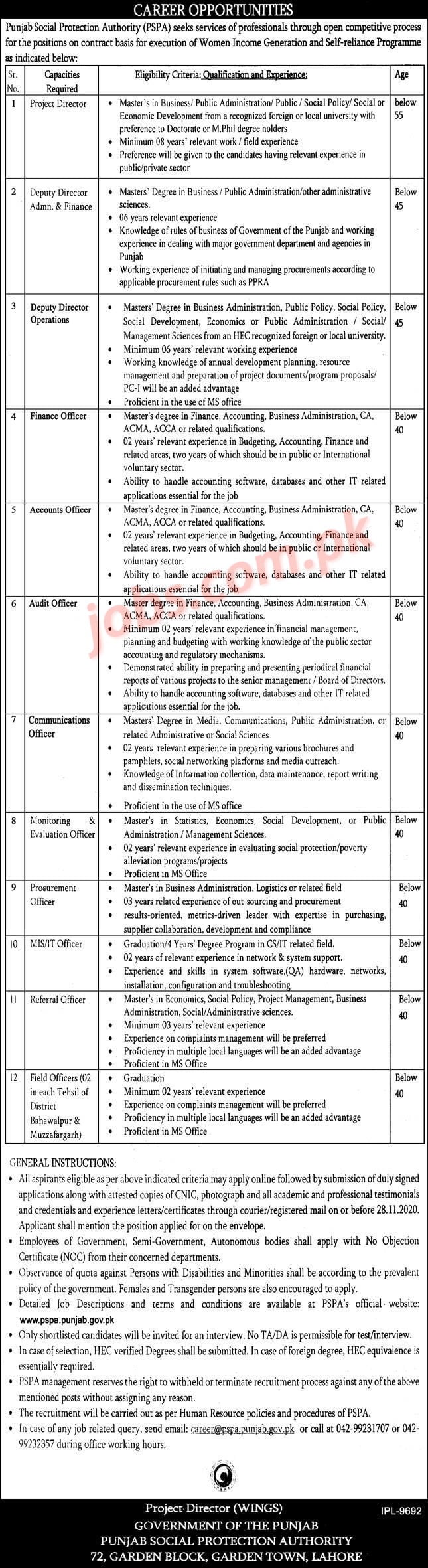 Punjab Social Protection Authority (PSPA) Jobs 2020 for Field Officers, IT, Admin, M&E, Accounts/Finance, Procurement & Other Staff