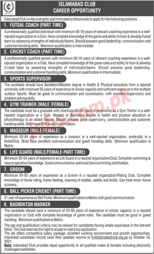 Islamabad Club Jobs 2021 for Sports Coaches, Supervisors, Gym Trainers, Life Guards and Other