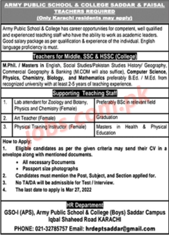 Vacant posts including Teachers and Support Staff are announced in Army Public School & College Karachi Pakistan as per 20 March 2022 advertisement in daily Newspaper today. Educational qualifications required is Graduation, Post Graduation, Bachelor Degree and Masters Degree. Apply at Army Public School & College latest jobs in Teaching and Admin department before closing date March 27, 2022 as per closing date in newspaper ad. Read complete ad notification online to know how to apply to latest Army Public School & College job opportunities.