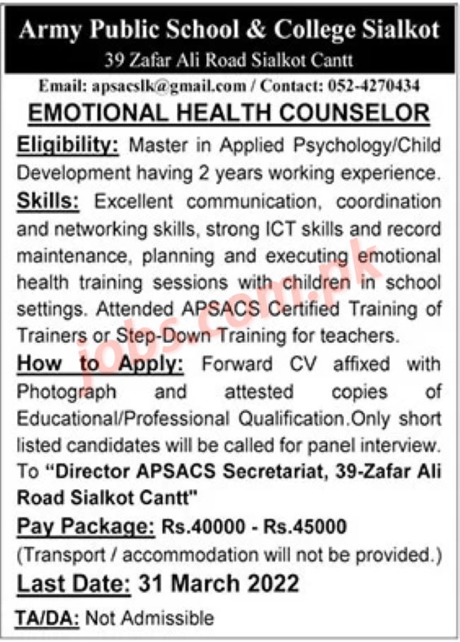 Vacant posts including Counselor are announced in Army Public School & College Sialkot Pakistan as per 20 March 2022 advertisement in daily newspaper today. Educational qualifications required is Post Graduation, Master in Applied Psychology etc. Apply at Army Public School & College latest jobs in Non-teaching department before closing date March 27, 2022 as per closing date in newspaper ad. Read complete ad notification online to know how to apply to latest Army Public School & College job opportunities.
