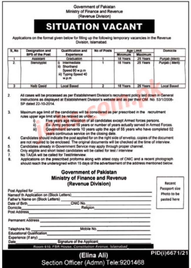 The Ministry of Finance & Revenue Pakistan invites applications for Assistant, Steno Typist and Naib Qasid advertised in daily newspaper dated 20 March 2022 for following vacancies in Islamabad, Pakistan. Candidates with Matric, Intermediate and Bachelor etc. education are eligible to apply to these vacancies starting from today. Eligible candidates can apply to latest Ministry of Finance & Revenue jobs until the closing date of April 4, 2022. Read complete ad online to know how to apply to latest Ministry of Finance & Revenue job opportunities.