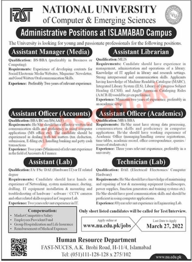 National University of Computer & Emerging Sciences jobs advertisement dated 20 March 2022 invites application for the vacant post of Assistant Manager, Assistant Officers, Library and Lab Staff in Islamabad Pakistan. Candidates with Intermediate, Diploma, Bachelor Degree and Masters Degree background are preferred as per latest notification. Starting from today, eligible candidates can apply to latest National University of Computer & Emerging Sciences jobs until the closing date of March 27, 2022. Read complete ad online to know how to apply to latest National University of Computer & Emerging Sciences job opportunities.