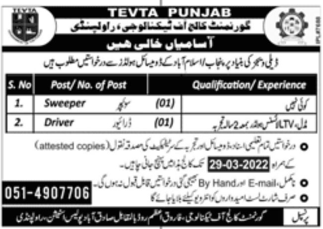 The TEVTA invites applications for Driver & Other advertised in daily newspaper dated 20 March 2022 for following vacancies in Rawalpindi, Pakistan. Candidates with Middle / Matric education along with valid driving license are eligible to apply starting from today. Eligible candidates can apply to latest TEVTA jobs until the closing date of March 29, 2022. Read complete ad online to know how to apply to latest TEVTA Punjab job opportunities.