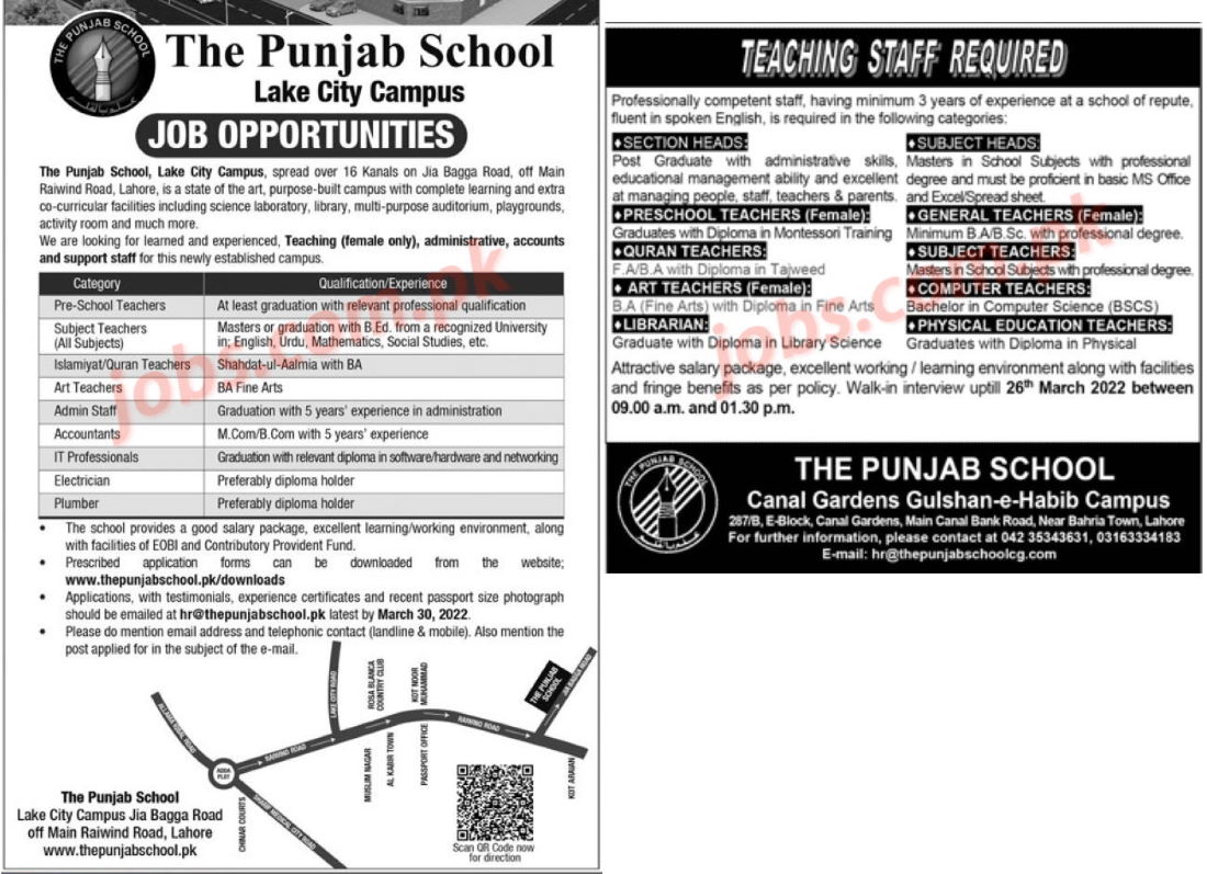 Vacant posts including Teachers, Subject Specialists, IT, Admin, Accounts & Other are announced in multiple campuses of The Punjab School in Lahore, Pakistan as per 20 March 2022 advertisement in daily newspaper today. Educational qualifications required is Diploma, Intermediate and Graduation (Bachelor and Master’s Degree) in relevant subject. Apply at The Punjab School latest jobs in both teaching and admin departments before closing date March 30, 2022 as per closing date in newspaper ad. Read complete ad notification online to know how to apply to latest The Punjab School job opportunities.