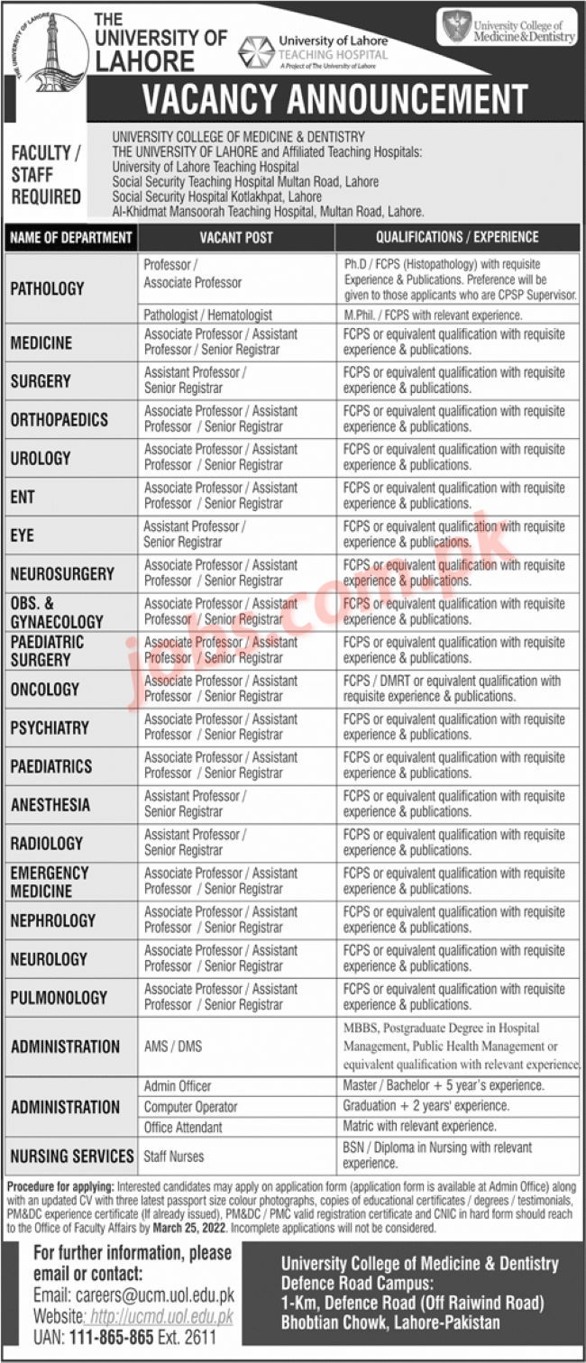 University of Lahore is inviting applications from eligible candidates for Teaching Faculty and Non-Teaching Staff in latest advertisement dated 20 March 2022. Required qualification for these vacancies is Matric, Diploma, Bachelor Degree, Master’s Degree, MBBS, PhD / FCPS and other from recognized institution. Eligible candidates must submit through mail on or before the due date of 25th March 2022. Read complete ad online to know how to apply to latest University of Lahore job opportunities along with other eligibility criteria.
