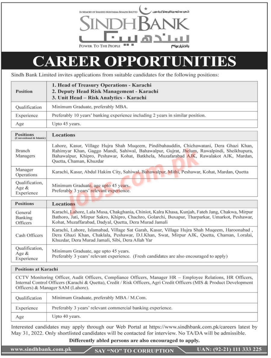 Sindh Bank Jobs 2022 for Unit Heads, Deputy Heads and Other