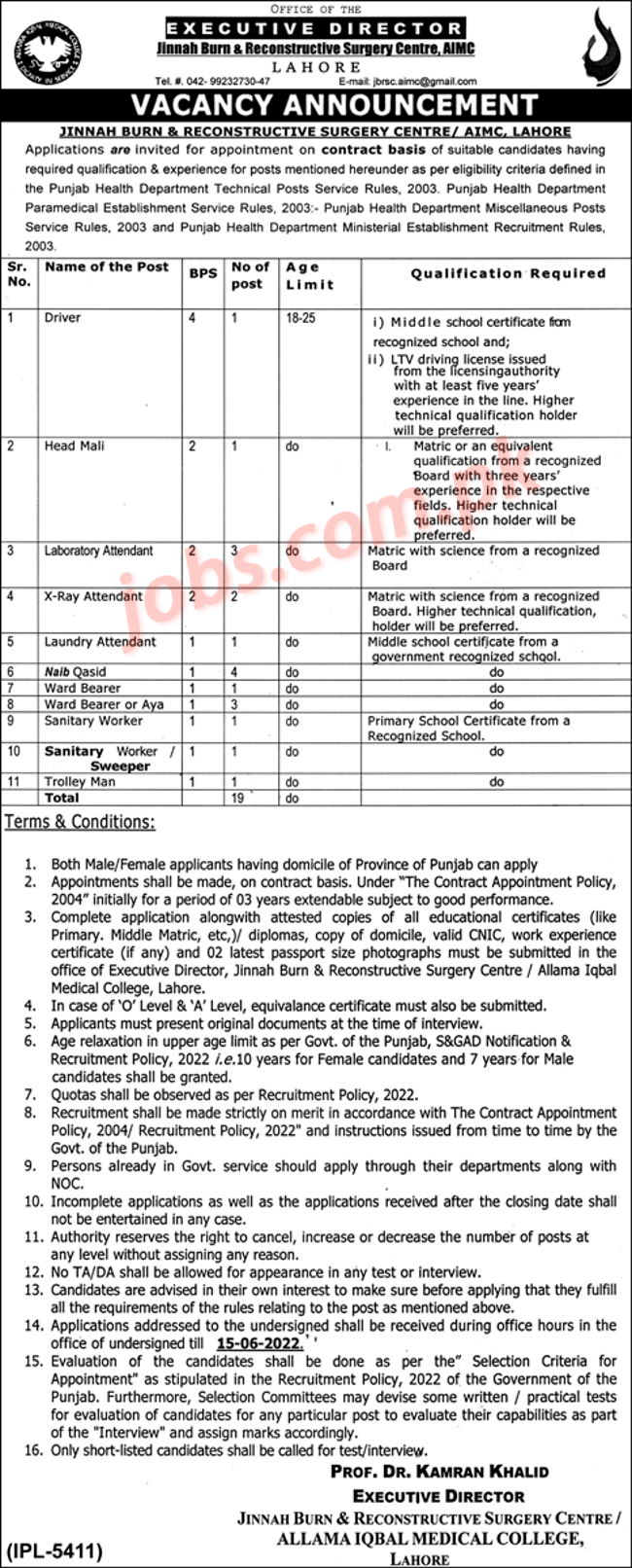 AIMC Lahore is inviting applications from eligible candidates for Driver, Lab Attendants, Naib Qasid & Other in latest advertisement dated 29 May 2022. Required qualification for the Driver, Lab Attendants, Naib Qasid & Other is Primary / Middle / Matric from recognized institution. Eligible candidates must submit application online or through mail on or before the due date of June 15, 2022. Read complete ad online to know how to apply to latest AIMC Lahore job opportunities along with other eligibility criteria.