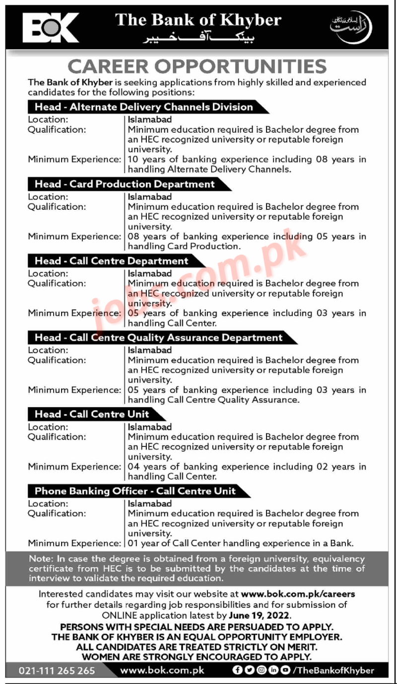 Bank of Khyber (BOK) Jobs 2022 for Department Heads, Phone Banking Officer and Other