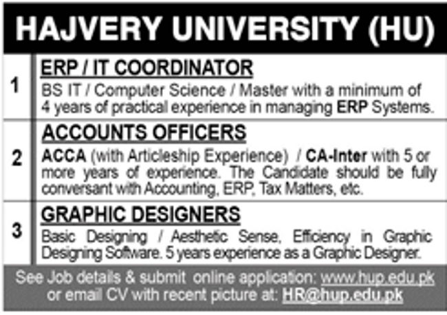 Hajvery University Jobs 2022 for Accounts Officer, Graphic Designers and IT Coordinator