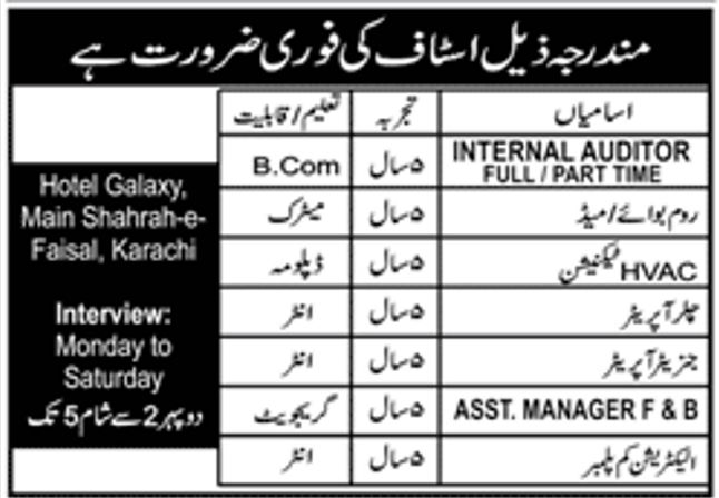 Hotel Galaxy Karachi Jobs 2022 for Assistant Manager, HVAC Technician, Operators and Other