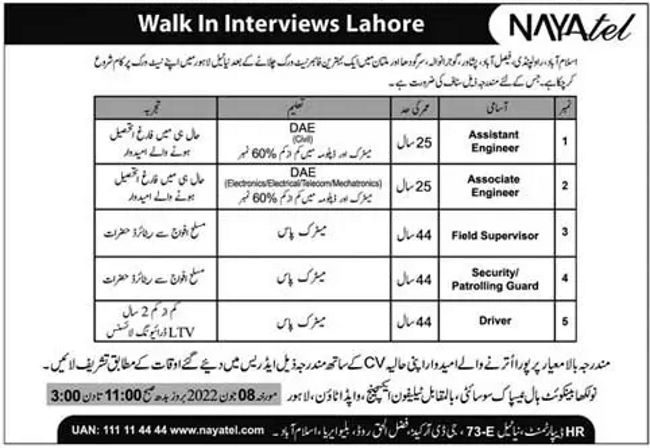 Nayatel Lahore Jobs 2022 for Assistant / Associate Engineers, Field Supervisor, Driver & Other