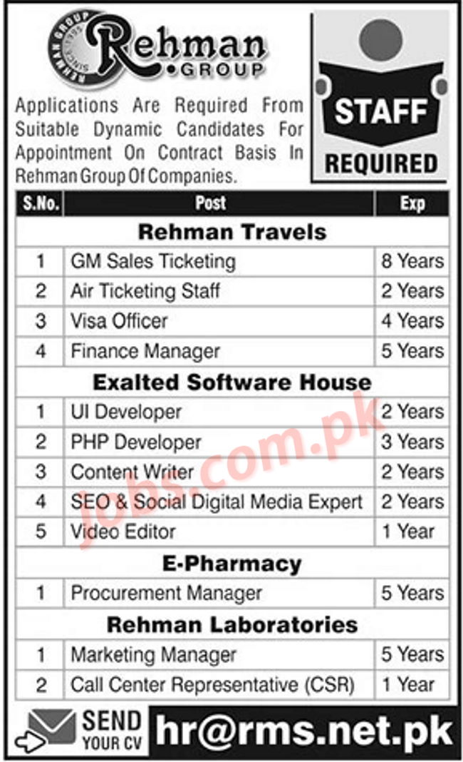 Rahman Group Jobs 2022 for IT, Sales, Air Ticketing Staff, Visa Officers, Accounts, Call Center & Other Staff