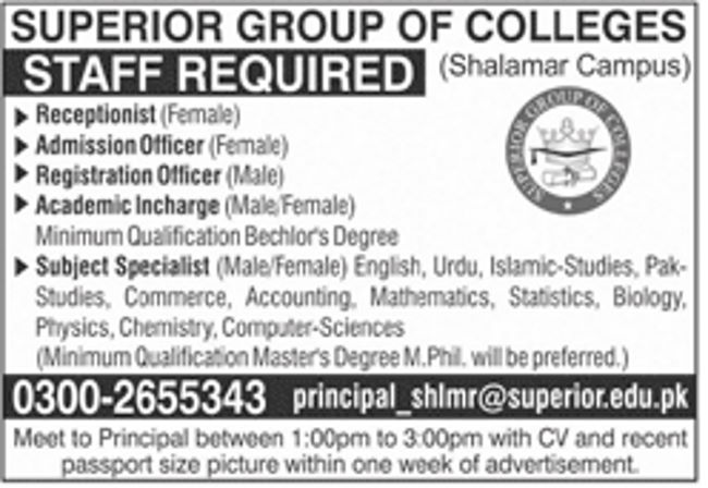 Superior Group of Colleges Jobs 2022 for Admission Officer, Registration Officer, Subject Specialists and Teachers