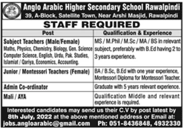 Teachers, Subject Teachers, Admin Staff and Other Jobs at Anglo Arabic Higher Secondary School Rawalpindi