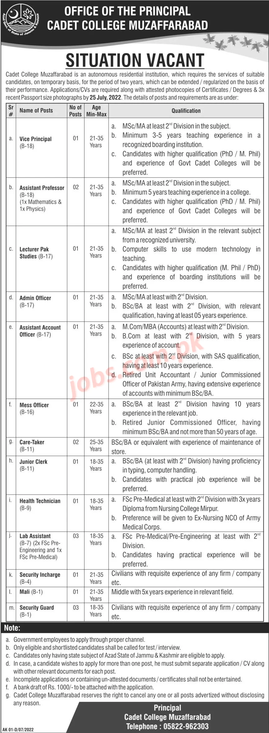 Cadet College Muzaffarabad Jobs 2022 for Teaching Faculty and Non-Teaching Staff