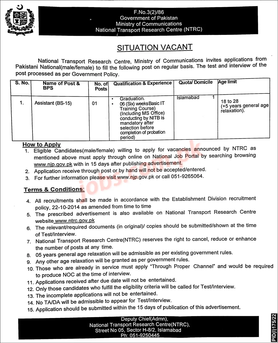 Ministry of Communications Islamabad Jobs 2022 for Assistant Vacancy