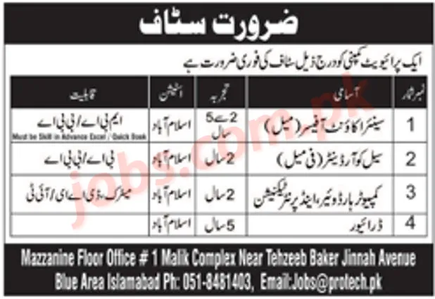 Protech Islamabad Jobs 2022 for Accounts Officer, Sale Coordinator, Computer / IT and Driver Staff