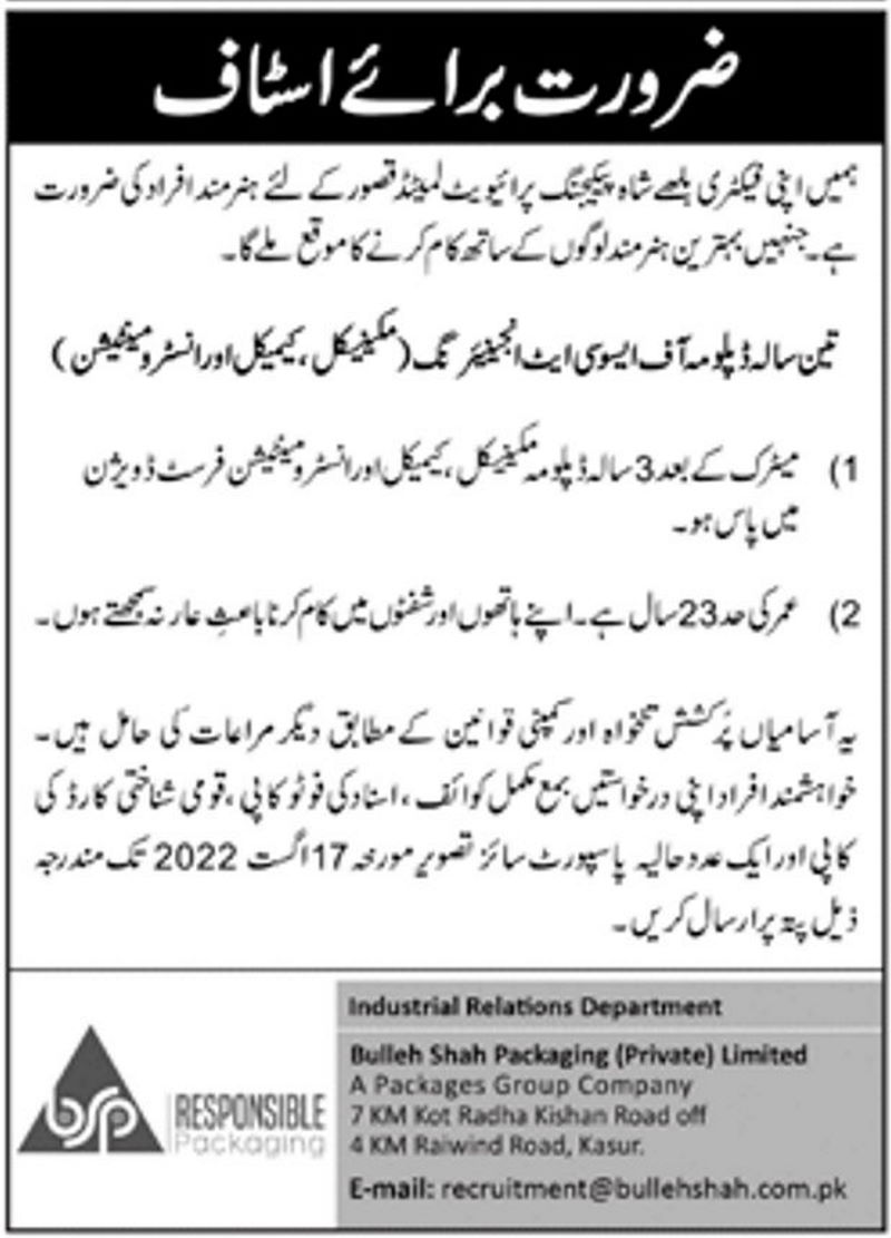 Bulleh Shah Packaging Jobs 2022 for DAE and Technical Staff