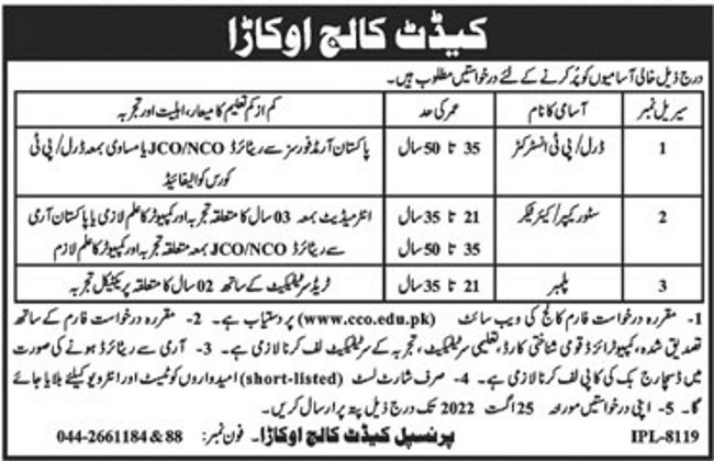 Cadet College Okara Jobs 2022 for Drill / PTI Instructur, Store Keeper, Care Taker and Other