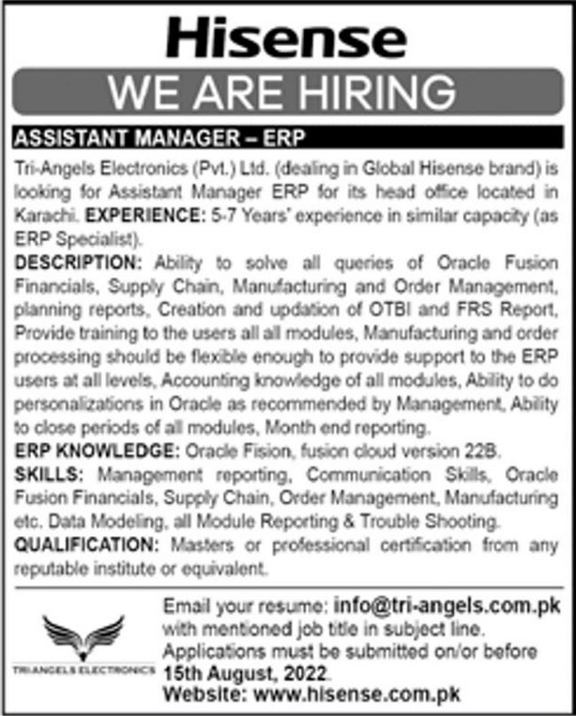 Hisense Tri-Angles Electronics Jobs 2022 for Assistant Manager / ERP Vacancy