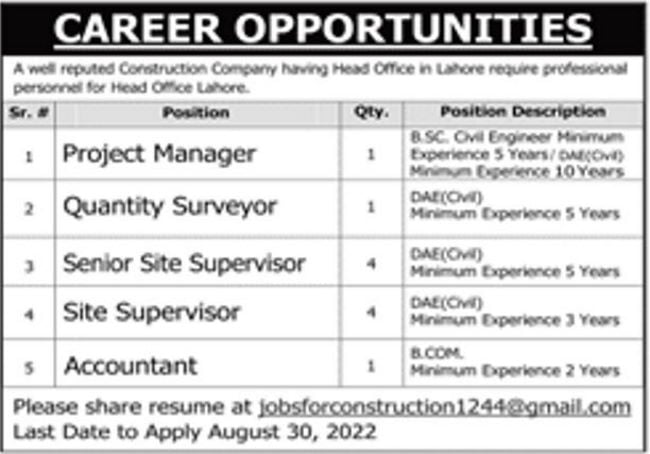 Lahore Construction Company Jobs 2022 for Site Supervisors, Project Manager, Accountant, QS and Other