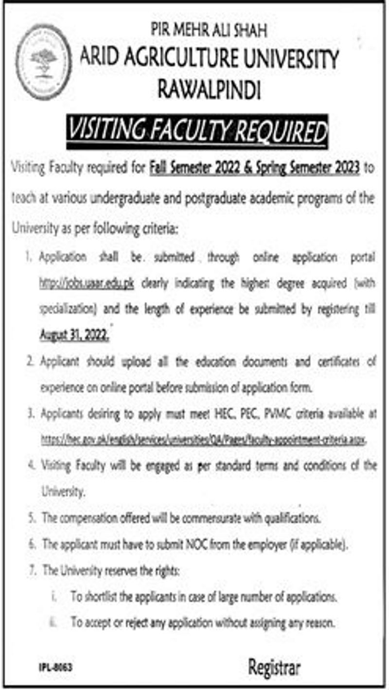 PMAS ARID Agriculture University Rawalpindi Jobs 2022 for Teaching Faculty