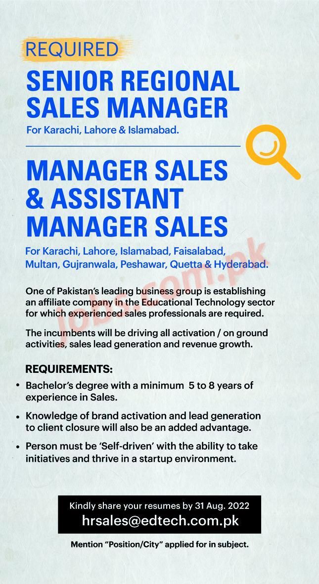 Edtech Jobs 2022 for Manager Sales, Assistant Manager Sales and Regional Sales Manager (Lahore, Islamabad, Karachi)