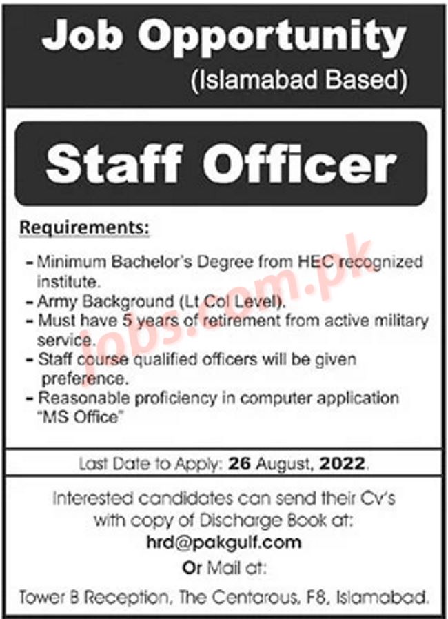 Pakgulf Islamabad Jobs 2022 for Staff Officer