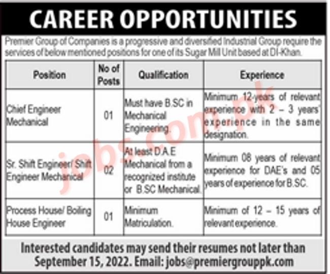 Premier Group Jobs 2022 for Engineering, Shift Engineers, Boiling House Engineer and Other