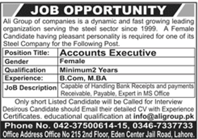 Ali Group Lahore Jobs 2022 for Accounts Executive