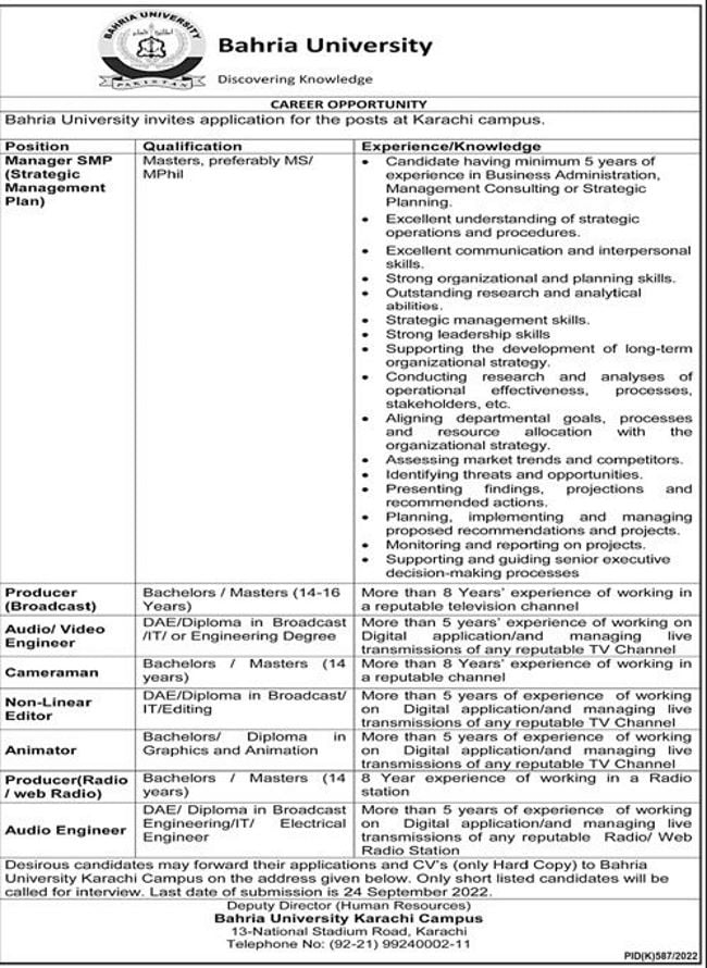 Bahria University Karachi Jobs 2022 for Manager, Producer, Multimedia Staff and Other